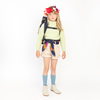 Open the velcro and unfold the back panel. Slide the back straps onto the stabilizing aluminum frame by moving the black arrow to the correct length for your child. Remove the info card and secure the back straps.